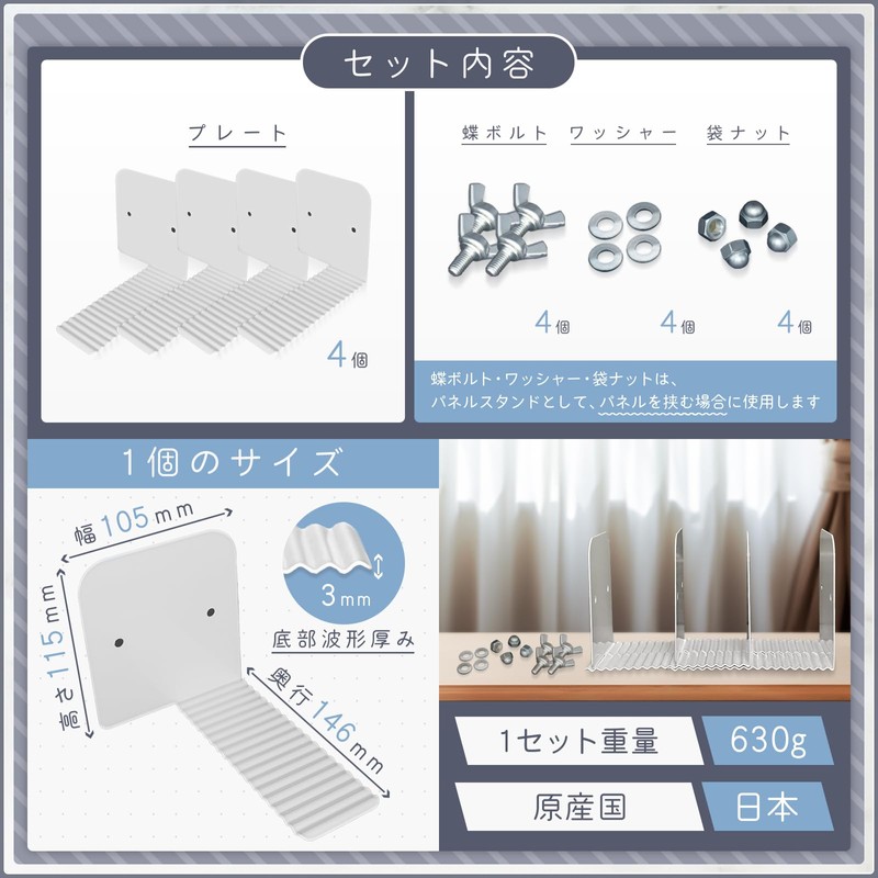 [Product Details] [Set contents] Plate x 4; Bag nuts x 4; Washers x 4; Wing bolts x 4. Size of 1: Width 4.1 x Height 4.5 x Depth 5.7 inches (105 x 115 x 146 mm); Bottom corrugated thickness 0.1 inches (3 mm). [1 set weight] 630g Country of Origin: Japan: ISO certified factory.