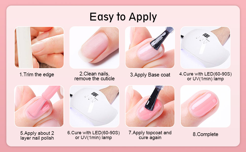 - 21 Day Lasting: If used correctly, gel polish can last 2-3 weeks. The nail polish must be solidified under LED/UV light. The duration of the LED light is 60-90 seconds and that of the UV light is 2-4 minutes.