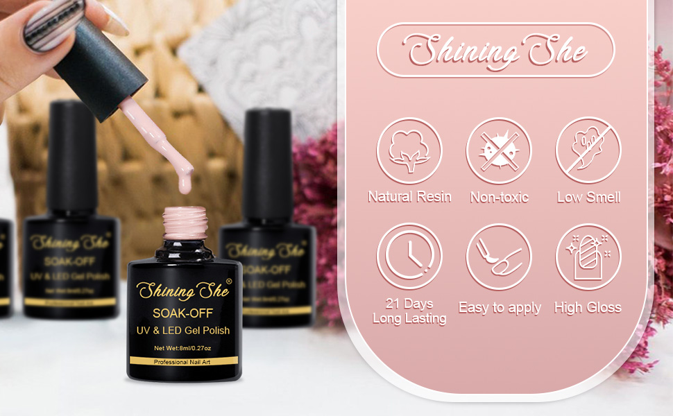 - Materiale Naturale: Gel semipermanente unghie Shining She è realizzato in resina naturale al 100%, sana, amichevole, sicura, non tossica e a basso odore, non danneggia le unghie e la pelle e può essere utilizzato con fiducia.