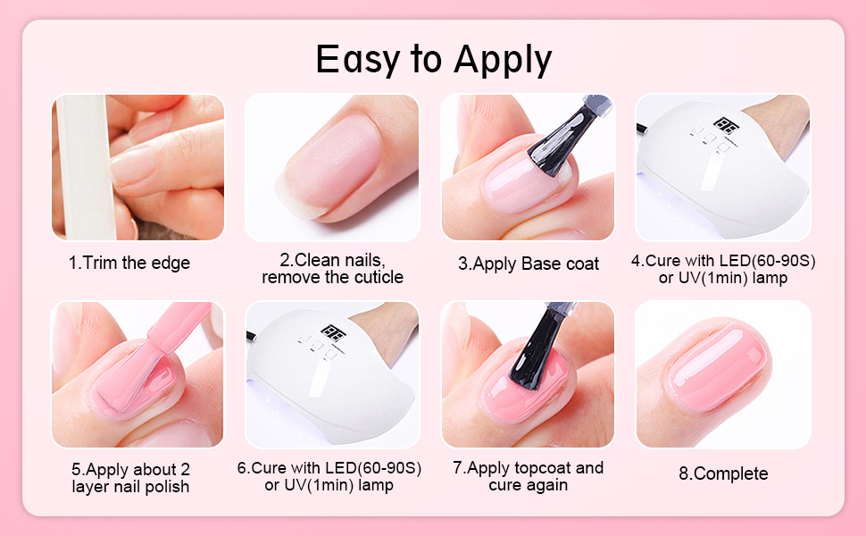 - 21 Day Lasting: If used correctly, gel polish can last 2-3 weeks. The nail polish must be solidified under LED/UV light. The duration of the LED light is 60-90 seconds and that of the UV light is 2-4 minutes.