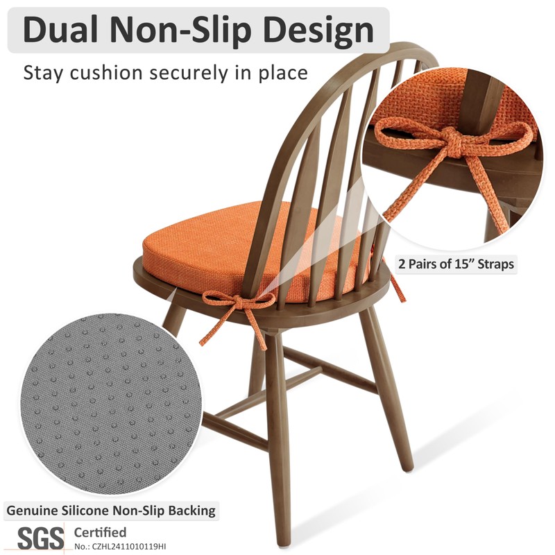 - 【Premium Silicone Non-Slip Bottom】The bottom features a real silicone non-slip backing(SGS certified for quality, No.: CZHL2411010119HI), softer and more slip-resistant than normal plastic materials. The particles stay intact and won’t damage chair surfaces, delivering reliable and lasting anti-slip performance. Additionally, two pairs of 15-inch straps provide extra security, ensuring the indoor chair cushion stays firmly in place during use.