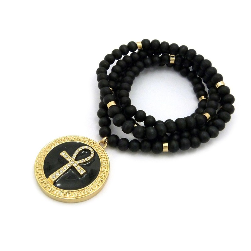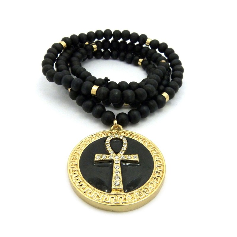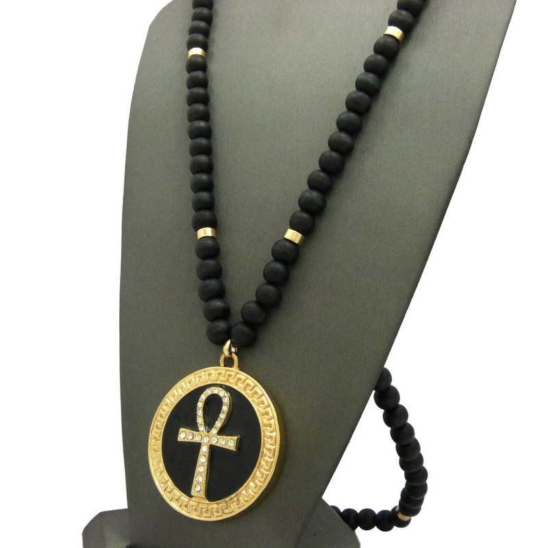 Shiny Jewelers USA Mens Gold Silver Egyptian Ankh Cross Round Pendant Charm 36" Wood Bead Chain Necklace (Gold)