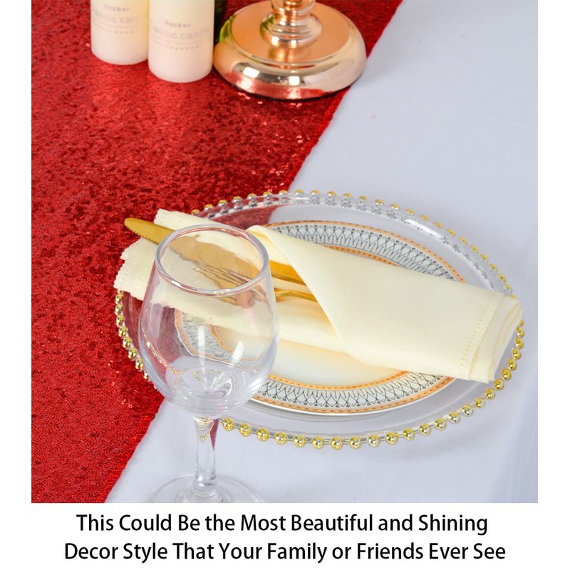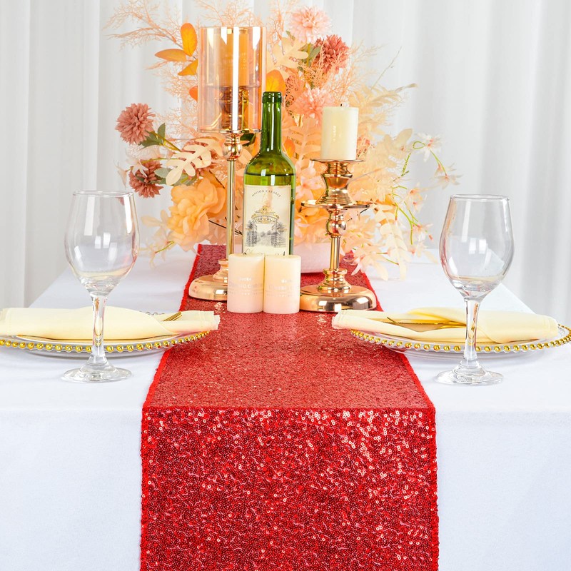 • Table Runner: 1pc 12x72-inch red sequin table runner. This rectangle table cover can fit a 6ft rectangular table or round table well. This sparkly table cover is great for event table decorations.