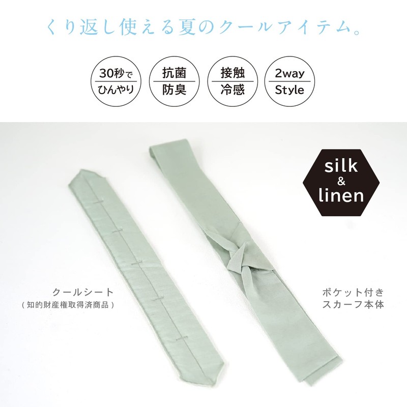 - Set Contents: Scarf body, cool sheet (1 piece); Size: Scarf: Width 1.8 x Length 32.3 inches (4.5 x 82 cm); Cool Sheet: Width 1.7 x Length 15.0 inches (4.3 x 38 cm); Material: Fabric: 88% silk, 22% linen, Cool Sheet Contents: Absorbent polymer