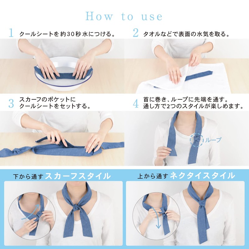 - Washable natural fiber soft scarf This is a separate scarf series that uses a cold "cool seat" in a scarf with washable pockets. The airy fabric texture and color lineup is a pastel style with a refreshing breeze. Just fill the cool sheet with water in the package (70cc) and soak for 30 seconds, and the proprietary absorbent polymer sheet will inflate. It gently cools your neck for a long period of time while slowly vaporizing the included moisture