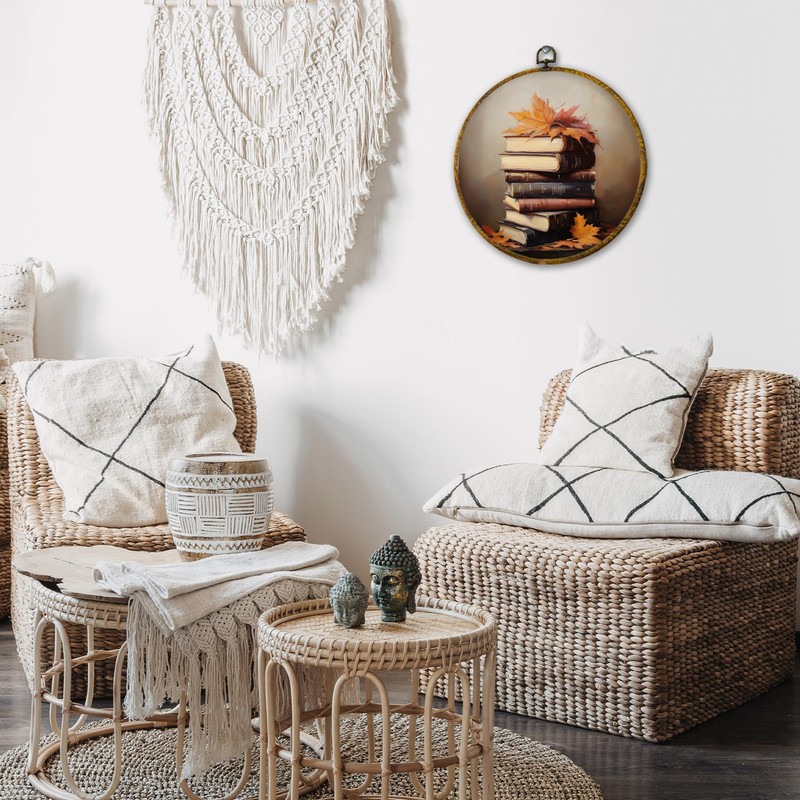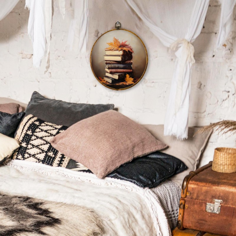 shiviody Fall Book Canvas Wall Art Decor, Autumn Maple Leaf Still Life Wall Decor, Rustic Books Thanksgiving Round Hanging Frame Prints Decorations for Home Farmhouse Kitchen 10"x10"