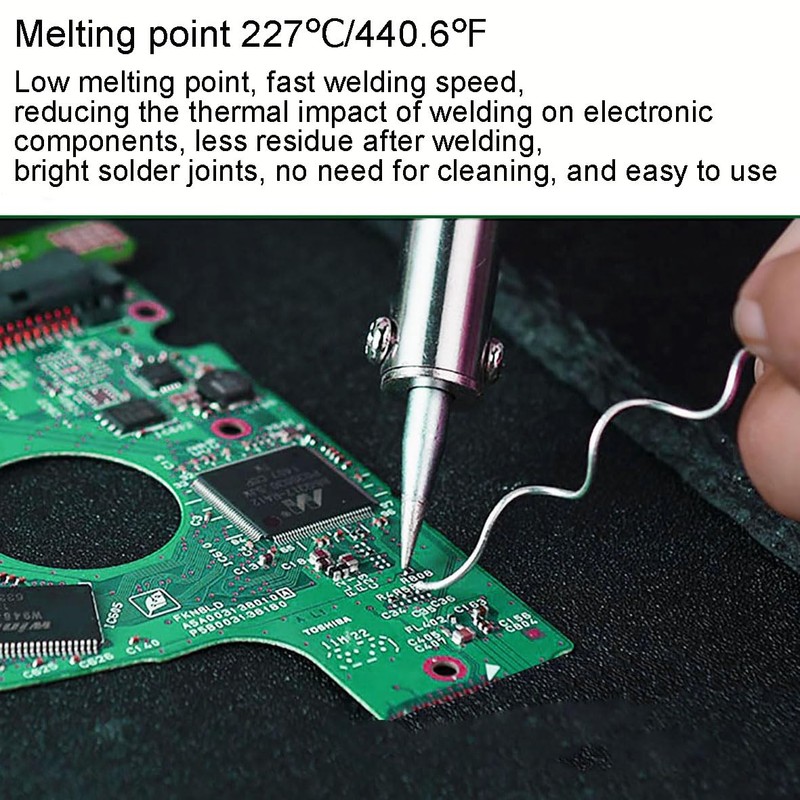 • The melting point of solder wire is 227℃/440℉. It has good fluidity, strong welding and fast welding speed. It reduces the thermal impact of welding on electronic components. It is suitable for most soldering tools and improves welding efficiency