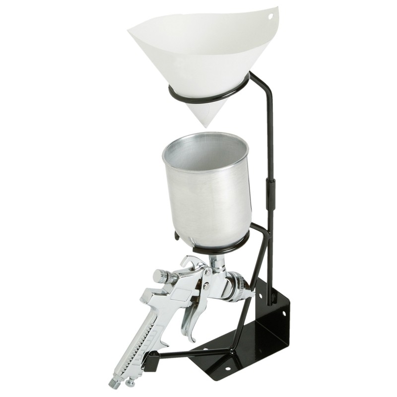 Fits all gravity fed spray guns. Can be mounted on wall or tabletop. Removable filter holder. Spray Gun Not Included.