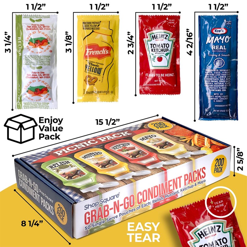 Grab-n-Go Condiment Packs - 50 Single Serve Pouches of Each: Ketchup, Mustard, Relish, and Mayo - Great for Picnics, Boxed Lunch, BBQ, Travel, Picnic and Parties (200 Condiment Packets Total)