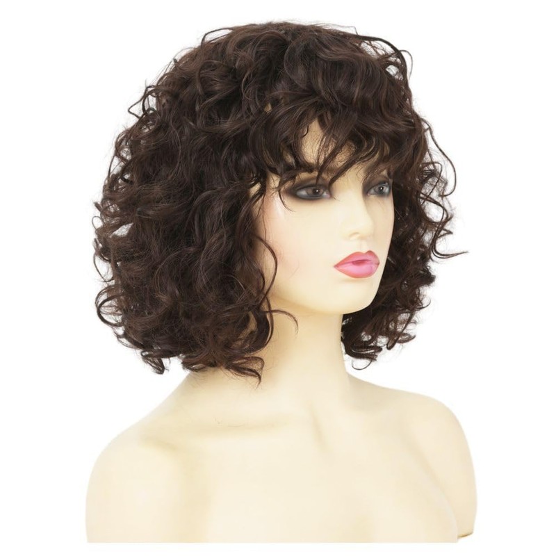 Short Curly Bob Wigs With Bangs Short Brown Curly Wig for Women,Heat Resistant Synthetic Natural Looking Daily Costume Hair Wig 12inch