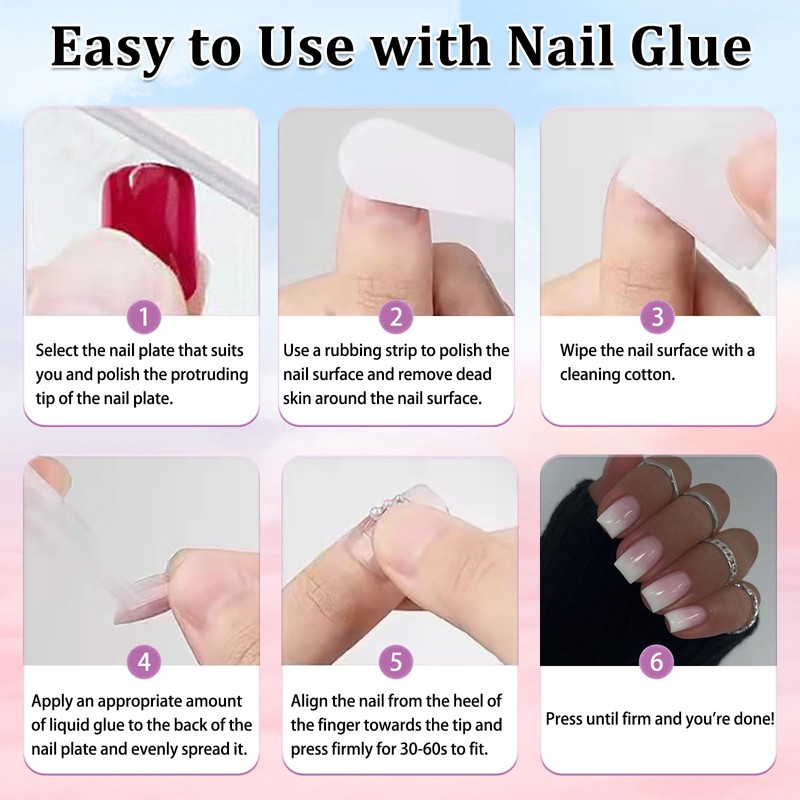 - 【Easy to Use】:Just gently polish your nails, file the sides and cuticle area with a nail file and clean the dust.Select the right size of square nail tips for each nail, and apply glue on nails, then press on them for 25s until it is secure