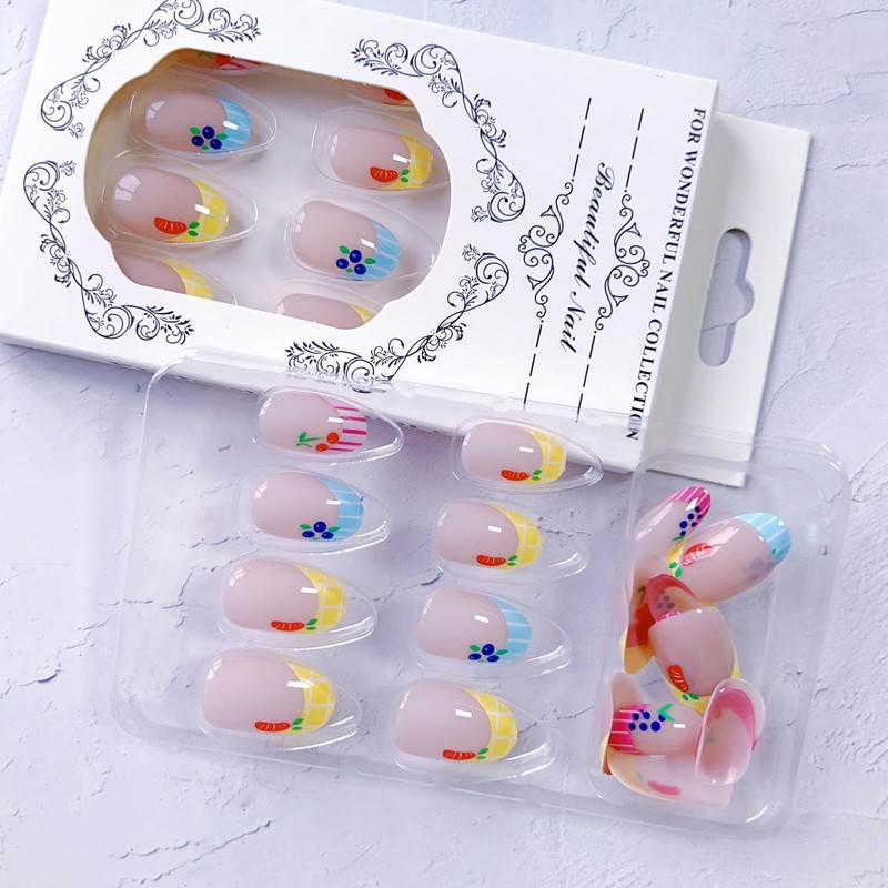 - Complete Set for Everyday Use: Includes 24pcs cute fruit press on nails short almond in 12 different sizes, 24 double-sided adhesive stickers, a nail file, and an easy-use wooden stick for nail tip removal—perfect for enhancing your everyday look