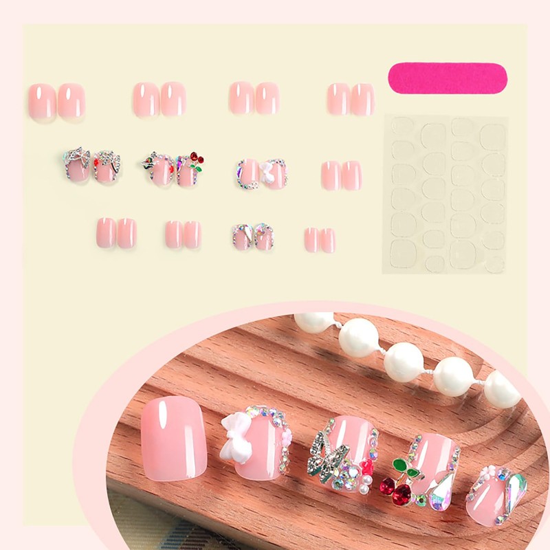 Short Press on Nails with Charms, Short Square Fake Nails 3D Butterfly Cherry Stick on Nails Nude Pink False Nails with Designs Glossy Acrylic Nails Press on Cute Bow Glue on Nails for Women 24Pcs