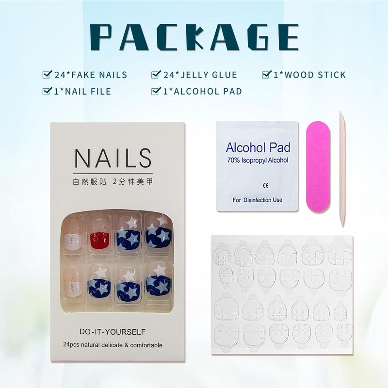 - 🗽【Convenient Set】: Each set includes 24 pieces of US fourth of july fake nails in 12 different sizes, providing a perfect fit for every nail. Complete with 1 piece of jelly glue, 1 nail file, alcohol cotton, and a wooden stick, this set has everything you need for easy application and removal.