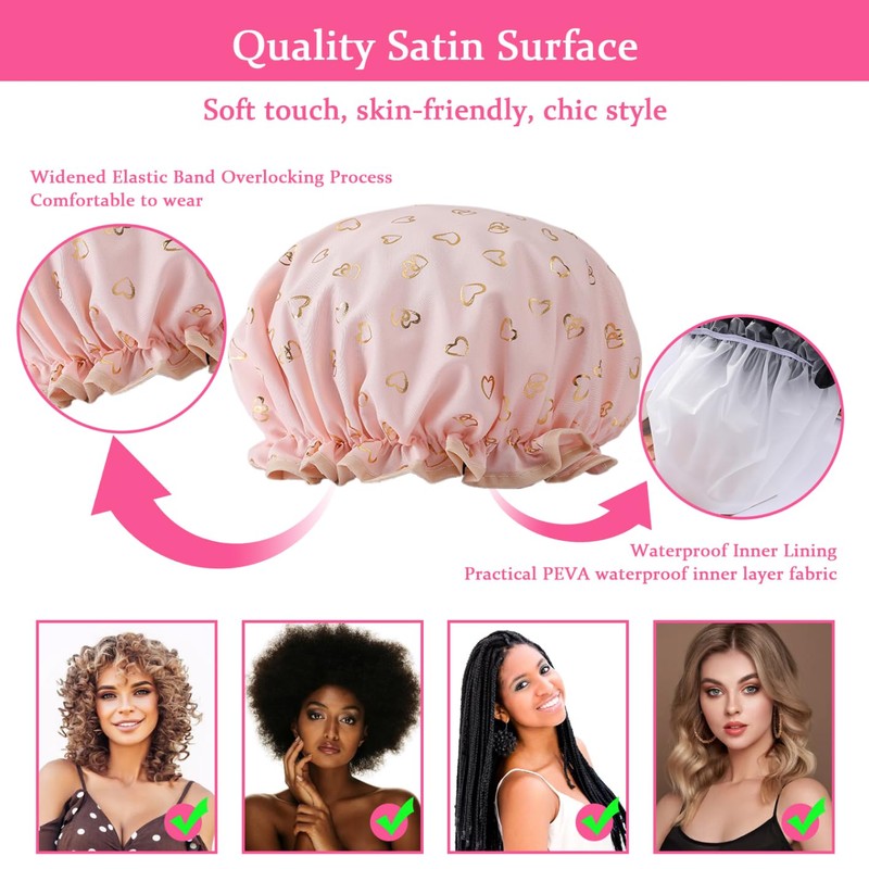 - Waterproof shower caps with double layers: these beautiful shower caps are environmentally friendly, skin-friendly and super breathable. Made of polyester and EVA fabric, double layer waterproof, effectively prevents your hair from getting wet when showering, and improves your shower experience