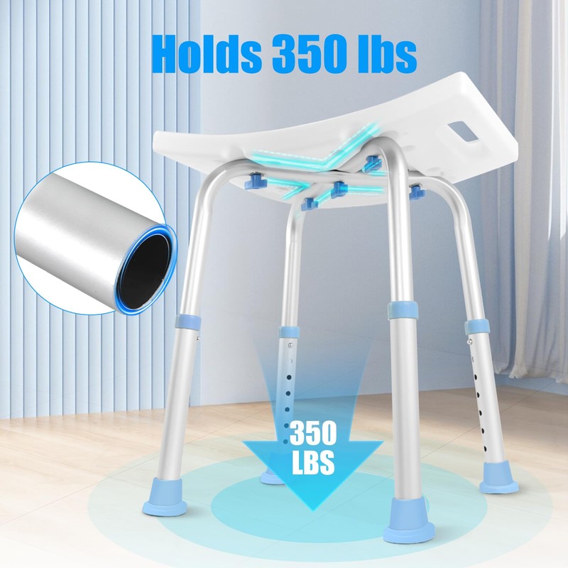 - Durable & Sturdy Construction: The chair legs and base support are made of premium aluminum alloy. The heavy-duty structure enables this shower chair for inside shower to sit on to bear a weight of 350lbs, and offer lasting durability, sturdiness and eliable support for safe bathing