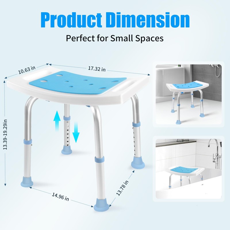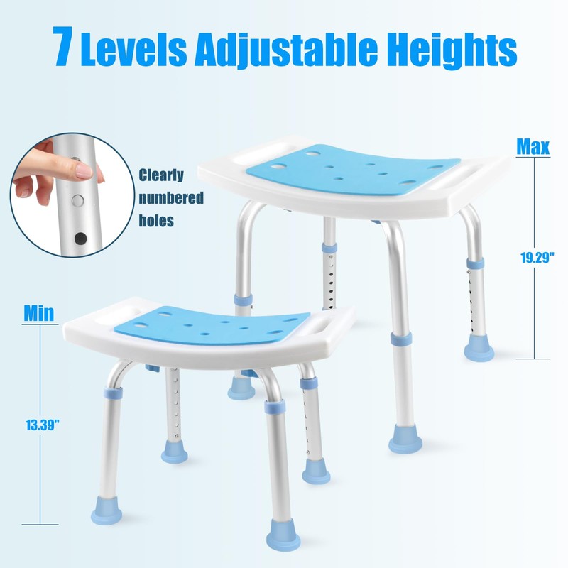 - Custom Height Adjustment: This shower bench offers 7 levels height-adjustable settings, with seats ranging from 13.39-19.29 inch, can be easily customize the chair for individual comfort and various bathroom configurations, adapts to any tub or walk-in shower