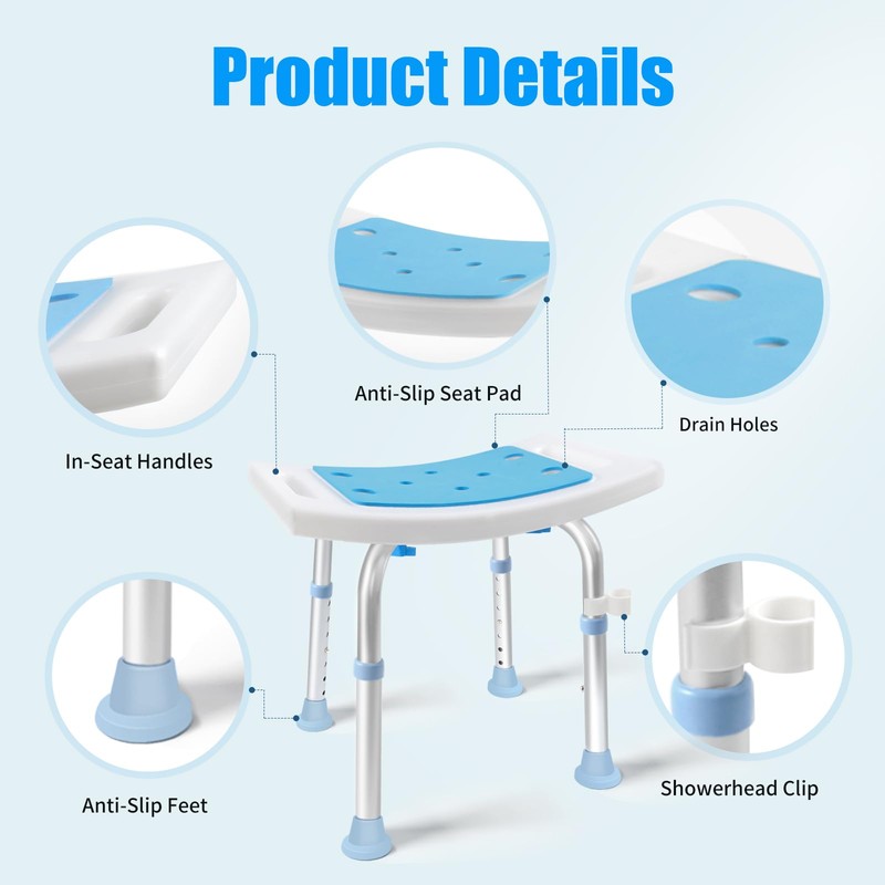 - Easy Setup & Portability: The bath stool features tool-free assembly and easy disassembly design for portability, making storage and transport effortless. Whether you're at home or travelling, this space-saving solution fits compact bathrooms or travel needs
