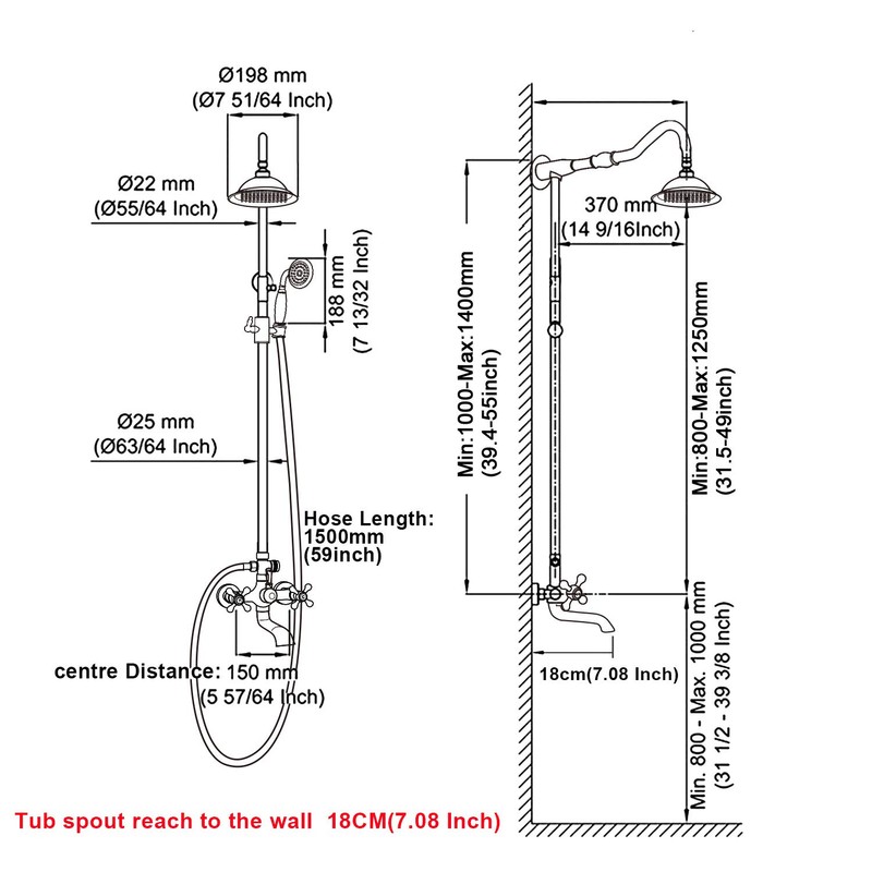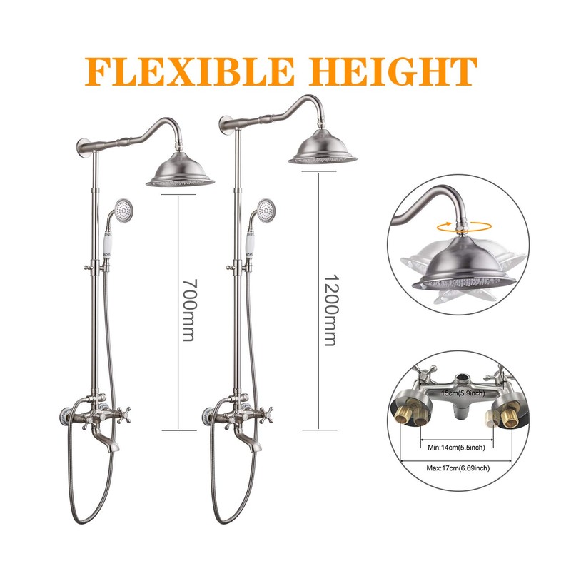 - Reliable Design:Shower height (slide bar) can be adjustable:70cm-120cm(27.5"-47"). Come with 12 inch Shower Extension Tube can add height to 100-150 cm (39"-59").,59” Shower Hose,double knobs cross handle to control water and hot water