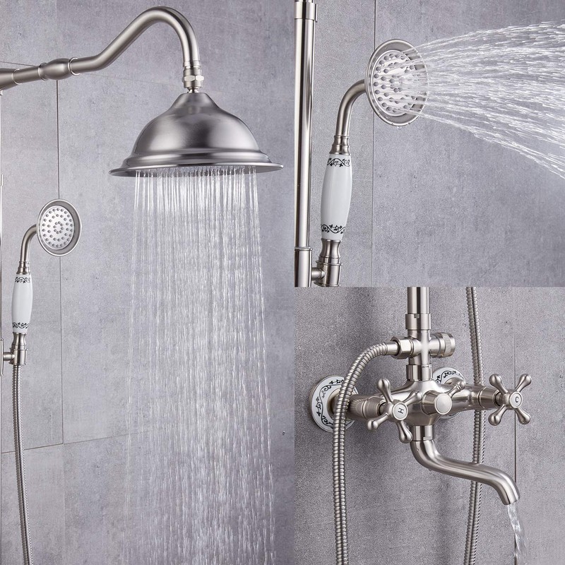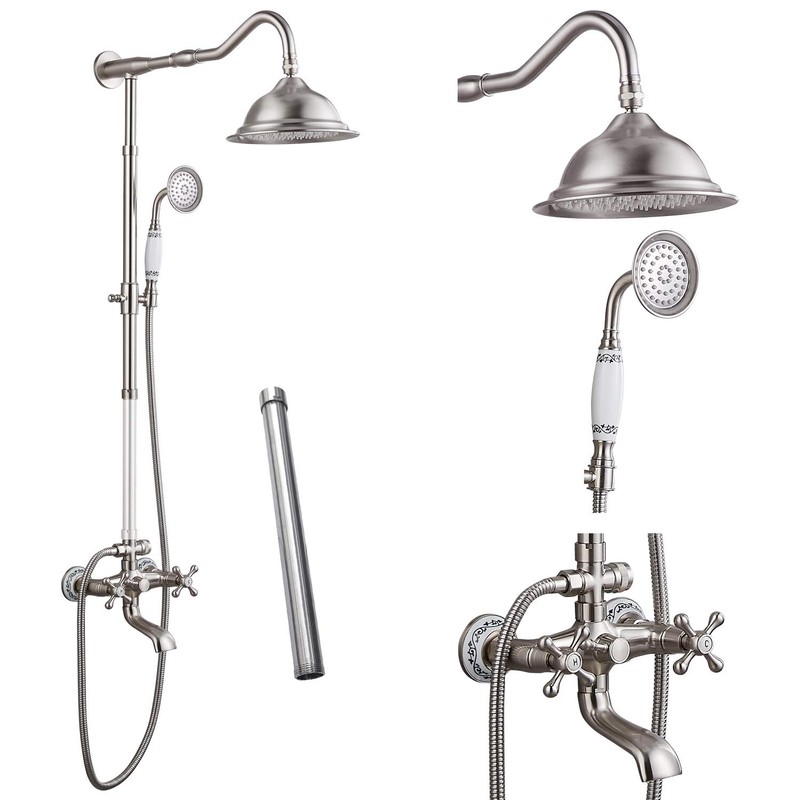 Shower System Set Complete Brushed Nickel 8 Rain Shower Faucet 2 Double Knobs Handle Triple Function Tub Spout Shower Fixture Unit 12 Inch Extention