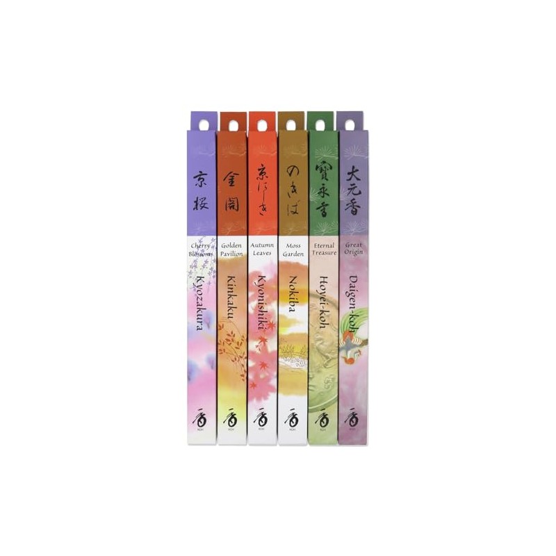 Explore a variety of traditional Japanese incense with Shoyeido's Daily Incense 6 Bundle Assortment. Contains one bundle each of: Great Origin, Eternal Treasure, Moss Garden, Kyoto Autumn Leaves, Golden Pavilion, and Kyoto Cherry Blossoms.