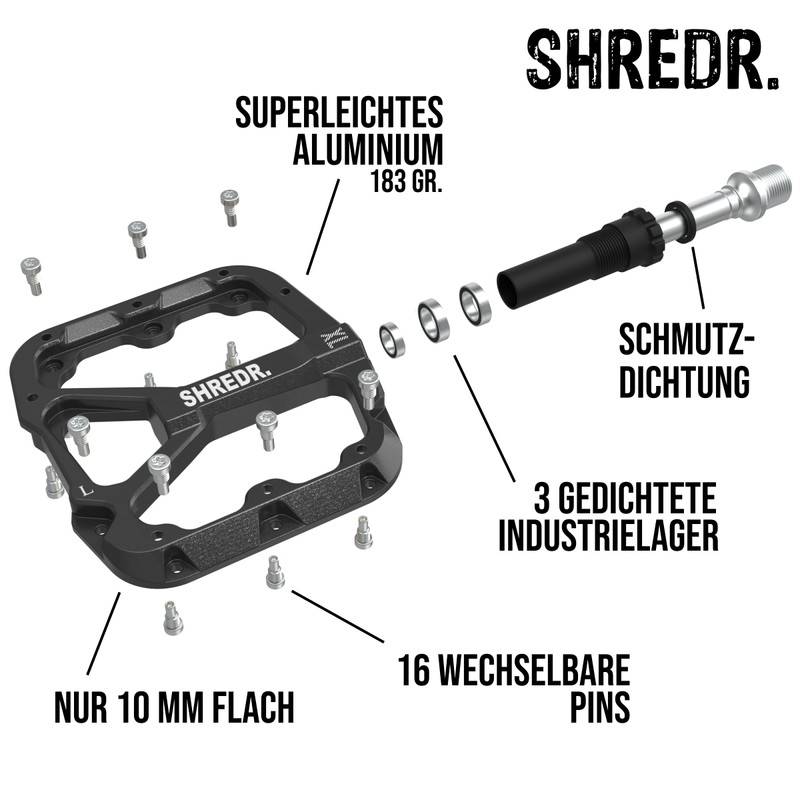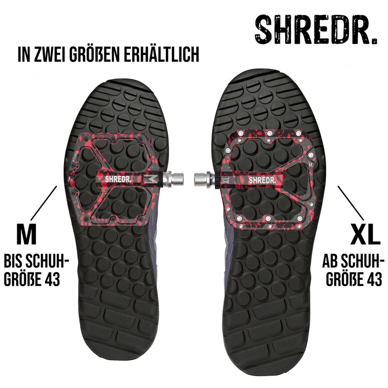 2 DIFFERENT SIZES: The Shredr. Flat pedals are available in 2 sizes and therefore adapt to your shoe size. We recommend size "M" up to shoe size 43, size "XL" from shoe size 43. Of course, you can also deviate from the recommendation if you prefer a certain size.
