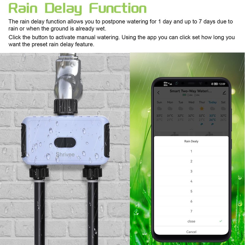 - Automatic watering and rain delay: the watering computer automatically adjusts your watering plan to the local weather forecast, or you can manually turn on the 24/48/72 hour rain delay mode to save water while avoiding overwatering.
