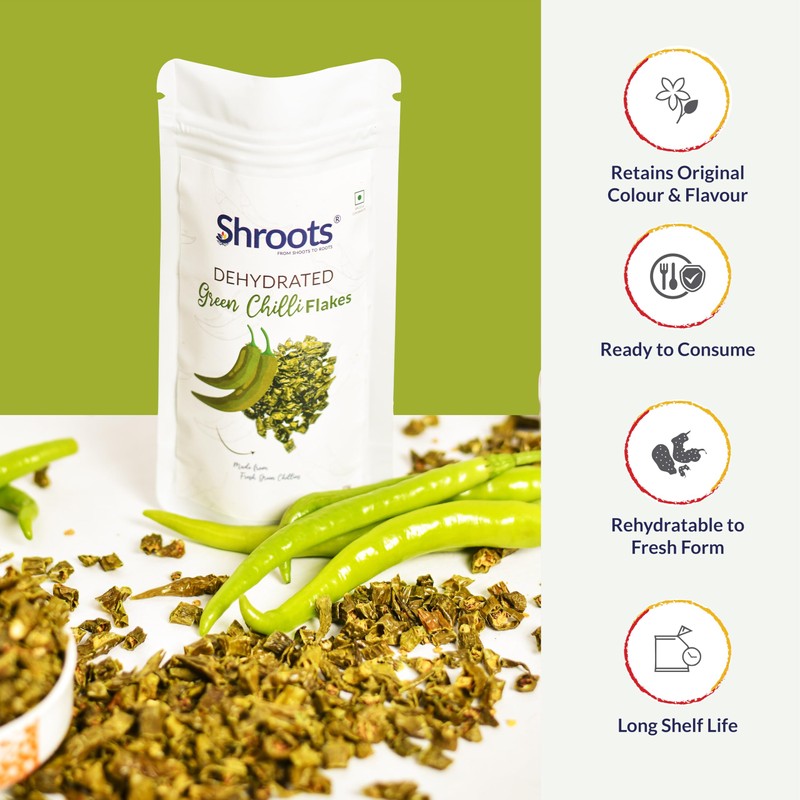 - How Many Serving?: Each 35g (1.23 oz) pack of SHROOTS Dehydrated Green Chilli Flakes contains approximately 35 servings, with a standard 1g serving size, making it easy to add the right amount to your meals. These ready-to-use flakes are gluten-free, vegan, and contain no added salt or preservatives, offering a pure and healthy choice to enhance your dishes.