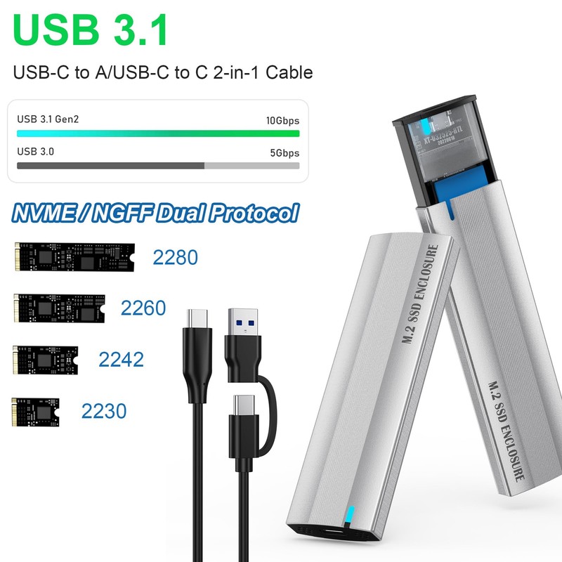 - 【SATA M.2 NVMe Enclosure】Suitable for M.2 NVMe SSD. B-Key SSD is not supported. The USB data cable has two convenient output ports: USB-C to A and USB-C to C. Switch seamlessly between devices as needed. 2-in-1 cable for versatile connectivity.
