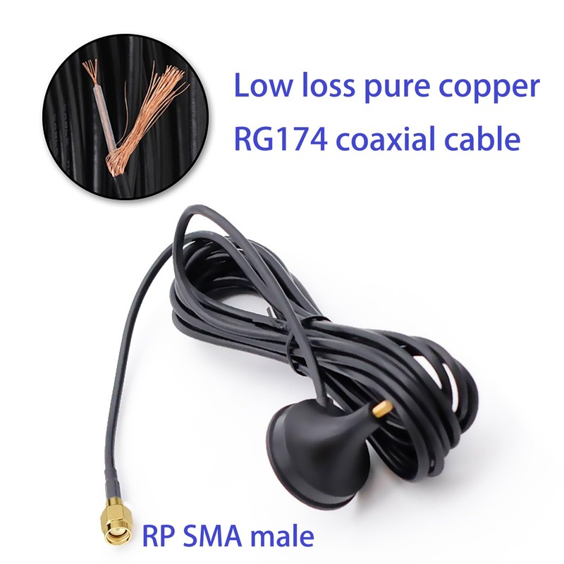 - Antenna connector: RP-SMA male; Connector material: Copper; Shell material:; Cable type: RG174 coaxial cable; Cable length: 1.5m/4.92ft; Antenna size: 3*3*22.2cm; Feature: with magnetic mounting base