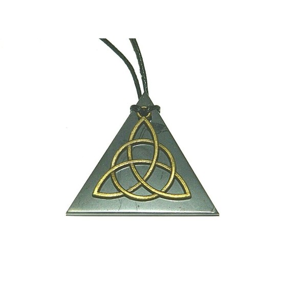 Shungite Pendant Triangle "Magic node": Shungite Triangle has length of the sides around 40mm and weight 7g. "Magic node" is made of metal (zinc alloy). Color: Antique bronze. Comes with a black waxed thread ( diameter 1mm). SHUNGITE is miracle natural stone. It protects the human biofield neutralizing the negative impact of electromagnetic fields and electromagnetic radiation. Shungite suits everyone both men and women. It makes the place around pure and safe and it also brings calm, good luck and success.