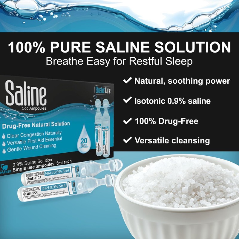 Shusher Care Saline Ampoules - Saline Solution for Nebulizer, Sodium Chloride 0.9% for Nose, Nasal Cleanse for Babies, Kids, & Adults, Sterile Nasal Care, Wound Cleansing - 50 Count (5ml Each)