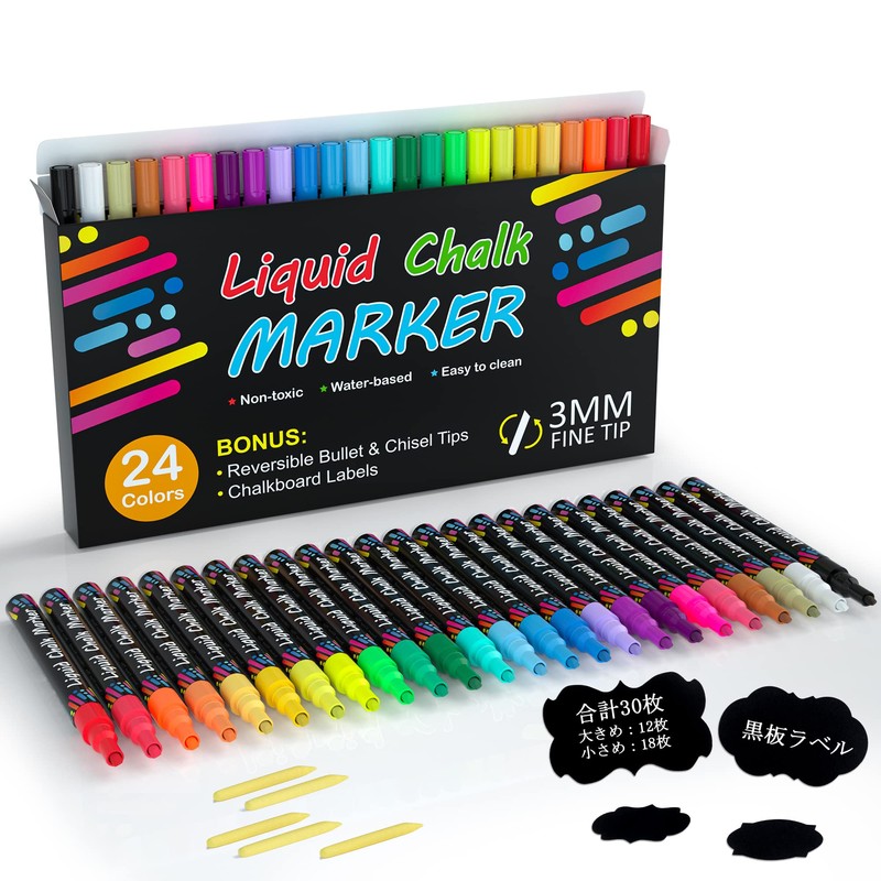 • 【チョークマーカーセット】鮮やかな色と淡い色が加わって全24色が揃っています。発色がよくて、滑らかな書き心地を持っています。水で簡単に消せるので、ご心配には及びません。ペン先詰め替え用ピンセット1つ、ツインペン先5つ、粘着ラベル30枚がギフト付きですから、ほかの補助道具を準備する必要がありません。ペン先の詰め替えも可能です。