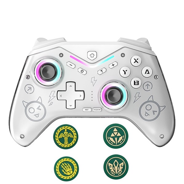 - 🎮【Customizable RGB Lighting & Personalization】 Stand out with 10 dynamic RGB lighting modes and 10 million color options, adjustable via shortcut buttons. The detachable magnetic faceplate features a Zelda-inspired design (includes 4 themed silicone thumbstick caps) for unique styling. The translucent panel syncs LED effects with gameplay—pulsing during action or dimming for battery savings. The ergonomic, textured grip (250g) ensures comfort during long sessions.