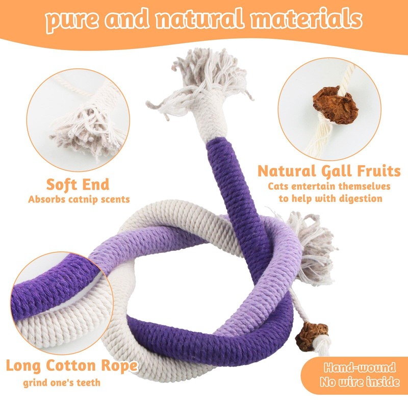 1. This cat teething rope is specially tailored to the needs of cats for playing and grinding teeth and has been specially added to greatly awaken the interest of cats. The catnip stick toy is made of high-quality materials, is safe, non-toxic and durable. Whether you play alone or interact with its owner, this interactive cat toy provides endless fun.