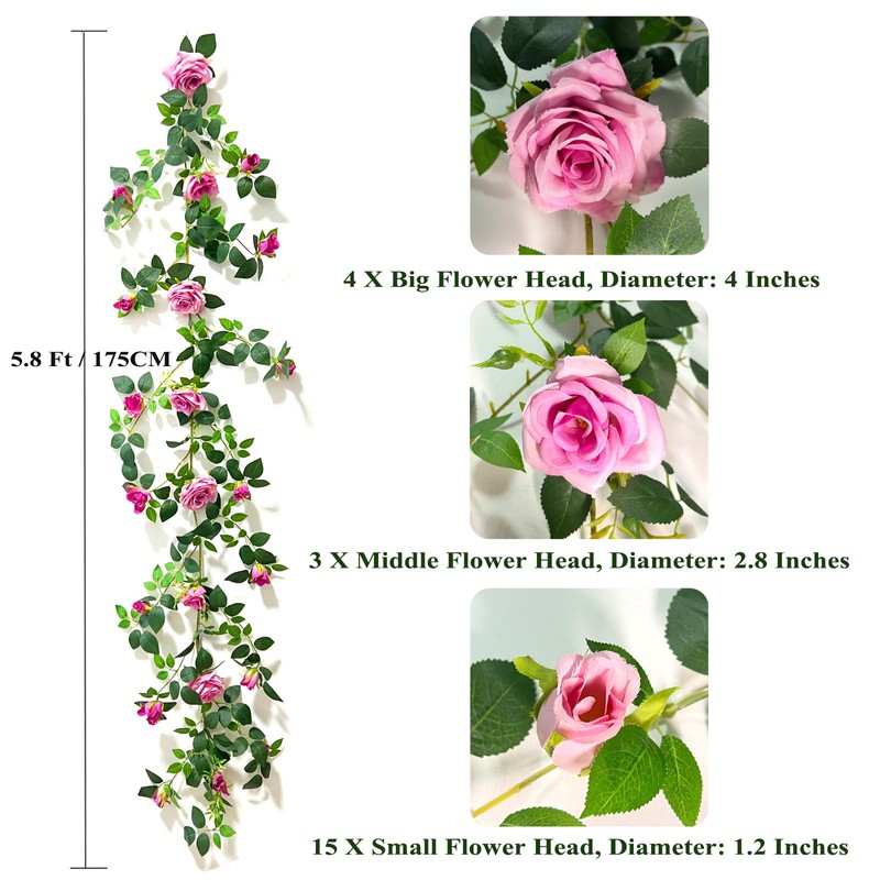 - 【Package & Size】 You will get 1 pack Shyshining artificial Purple rose garland. Each garland vine has four 3.9” big roses, three 2.7” mid roses, fifteen 1.2” small roses and full of green leaves. Each vine measures 5.9 feet (180 cm) long and can be trimmed or bent into any shape you desire. Their pliable, bendable stems make styling a breeze, allowing you to shape and reshape them at your whim. A good idea for wall doorway or an empty corner decoration.