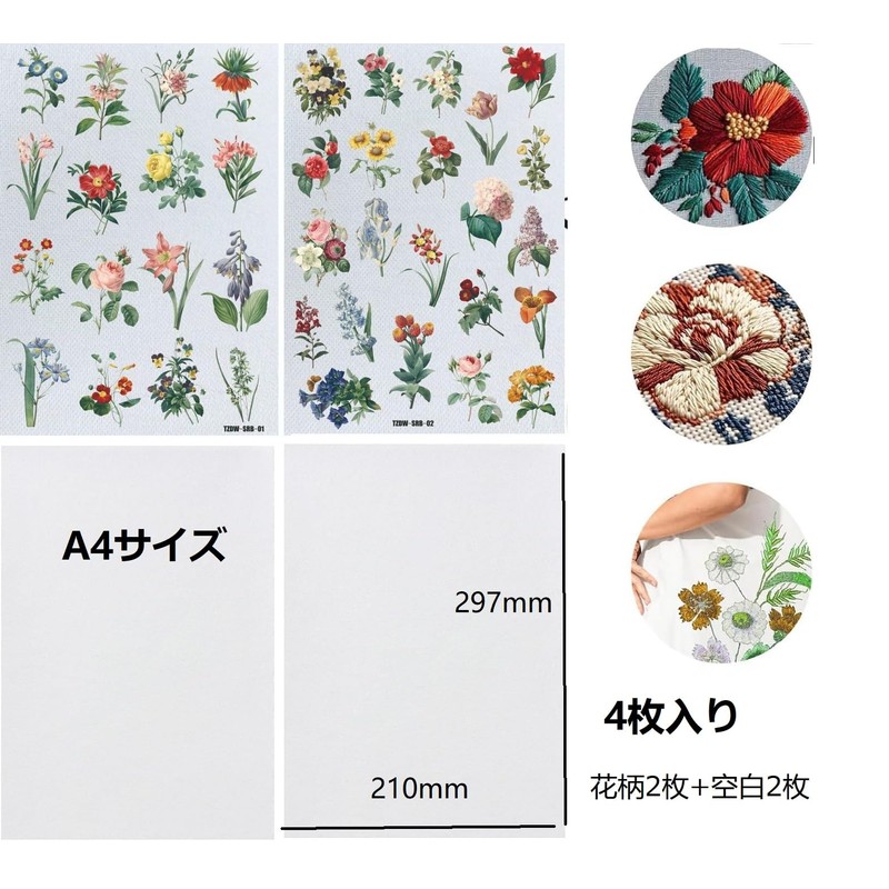 siawadeky Embroidery Sheets, A4 Paper, Set of 4, 2 Floral Patterns, 2 Blanks, Printable Embroidery Sheet for Embroidery, Flowers, Dissolving Embroidery Sheets, Printable, Water Soluble Film, Water