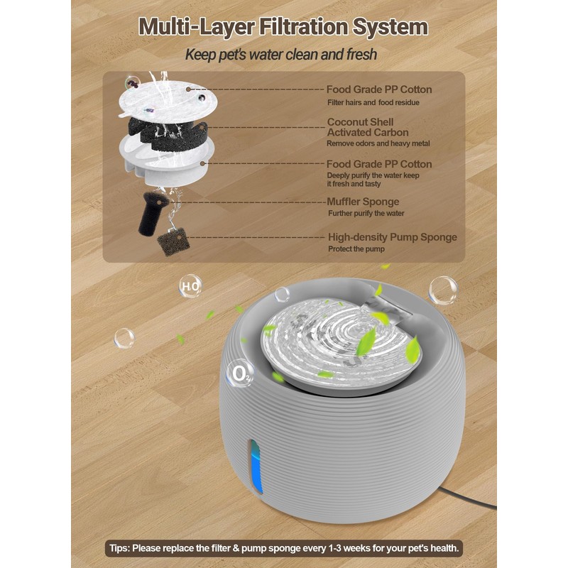 - 5-Layer Filtration: The water fountain with multi-layer filtration system can effectively remove hair, food residues, dust, odors, heavy metals from the water, providing clean and fresh water for your pets.