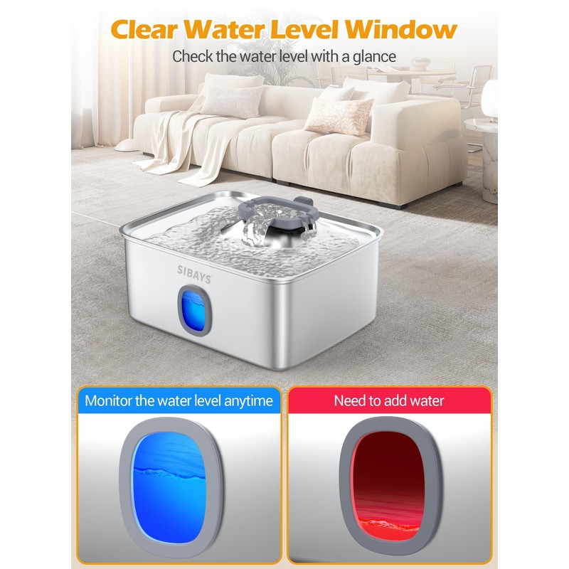 - Visible Window & LED Indicator: Our cat water fountain has a super-large viewing window, making it easy to monitor the water level and refill as needed. The blue light bright from the pump will help you see the level clearly. When the water level is low, the pump light will change from blue to red to reminder adding water.