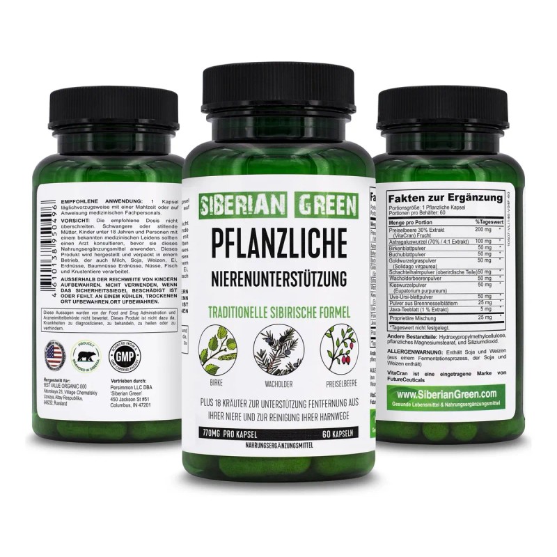 Siberian Green Detox Renal es un suplemento en cápsulas diseñado para la desintoxicación y soporte de los riñones, formulado siguiendo un enfoque tradicional. Presentado en un frasco con 60 cápsulas, este producto busca ayudar a los riñones a procesar y eliminar toxinas de manera eficiente, promoviendo la salud general del sistema urinario y contribuyendo al bienestar interno del cuerpo.