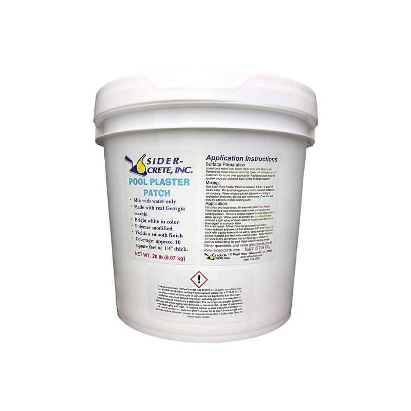 - Professional grade quality polymer modified pool plaster patch (20 lb pail). Mix with water only. 10 sf coverage @ 1/4". Sider Pool Plaster Patch is white in color and yields a smooth surface to match existing pool plaster. Supplied directly from Sider-Crete, Inc. Manufactured with marble and waterproof. Also available in a 3 lb container and 50 lb pail. Order placed during business days before 4pm Eastern time ships the same day via UPS GROUND.