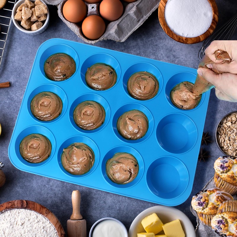 Sidosir Silicone Muffin Pans for Baking, Non-stick Silicone Regular Size Cupcake Molds for Baking, 12 Cups Muffin Pan for Freezing Eggs, Brownie (2, 2.7Inch Blue)