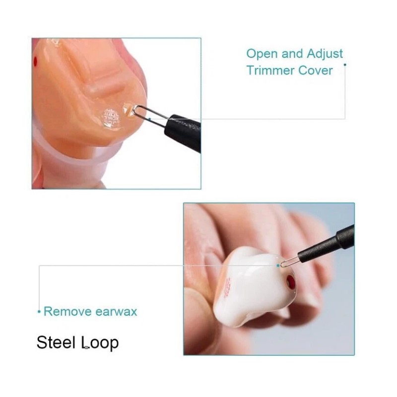 Use the wax loop to gently remove wax on the hearing aids, it also can be used to adjust the volume of ITC or ITE hearing aids.