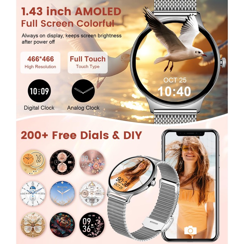 • 🍀 【Your Style, Your Screen- AMOLED Screen and Personalized Watch Faces】This LIGE women’s smartwatch features a 1.43-inch HD AMOLED touchscreen with stunning clarity. The AMOLED technology ensures not only a smooth, scratch-resistant surface but also vibrant colors that remain easy to read in any lighting condition. You can choose from over 200 personalized watch faces or upload your own photos to customize the watch’s design to your taste, showcasing your individuality.