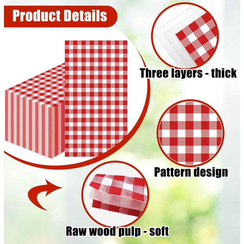 - Bathroom napkins guest disposable: You will receive 50 sheets of 3-ply red gingham napkins, measuring 4.3 x 7.87 inches folded and 13 x 15.7 inches unfolded. Enough quantity and suitable size meet your needs, leaving your guest a deep impression