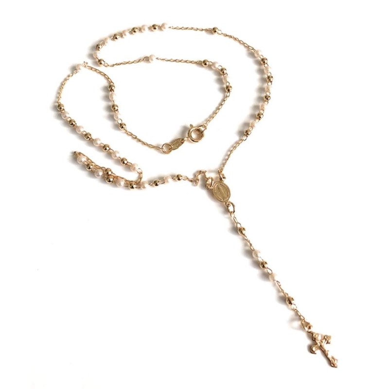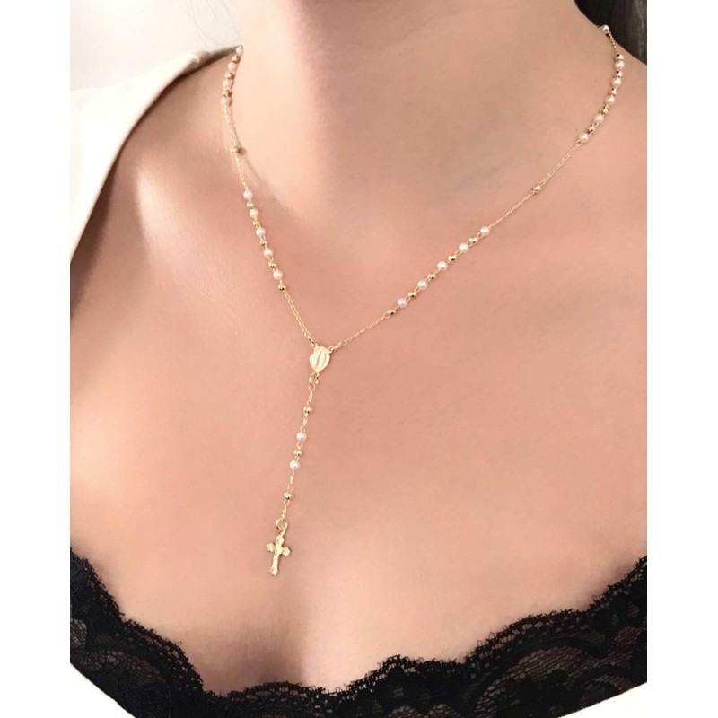 - Details: This elegant lariat necklace features delicate 3mm simulated pearls and round beads on a cable chain, with a springring clasp closure. The centerpiece is a petite Miraculous Virgin medallion, complemented by a 0.5" crucifix. The necklace measures approximately 17.5" or 45 cm in length, while the strand with the crucifix is 2.5" or 5.8 cm. The total length of the necklace is 20" or 51 cm, and the crucifix measures 0.5" or 1.2 cm.