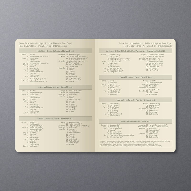- Chamois-coloured paper (80 gsm, PEFC-certified), printed in classy grey : monthly and annual overview, public holidays (D/AT/CH/UK/FR/BE/NL), overview of school holidays (DE/AT/CH/NL), units of measurement (EU/UK/US), a map of international time zones : elastic fastener, pen loop, quick pocket, archive pocket,two ribbon markers