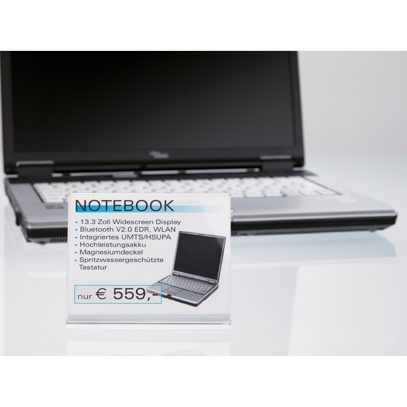 - Schräger Preisschildhalter / Tisch-Namensschild zur einseitigen Präsentation.