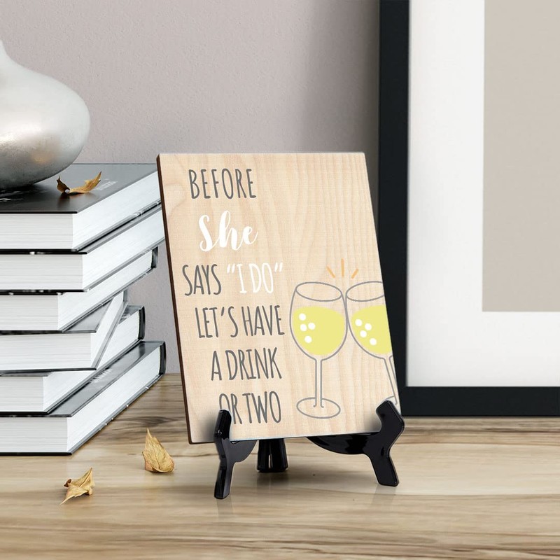 Signs ByLITA Before [name] says “I do,” let’s have a drink or two (2 Glasses), Table Sign with Acrylic Stand (6x8“)