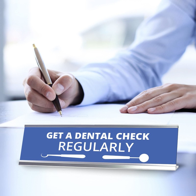 Signs ByLITA Get A Dental Check Regularly Dental Office Decor Silver Frame, Desk Sign (2x8“)